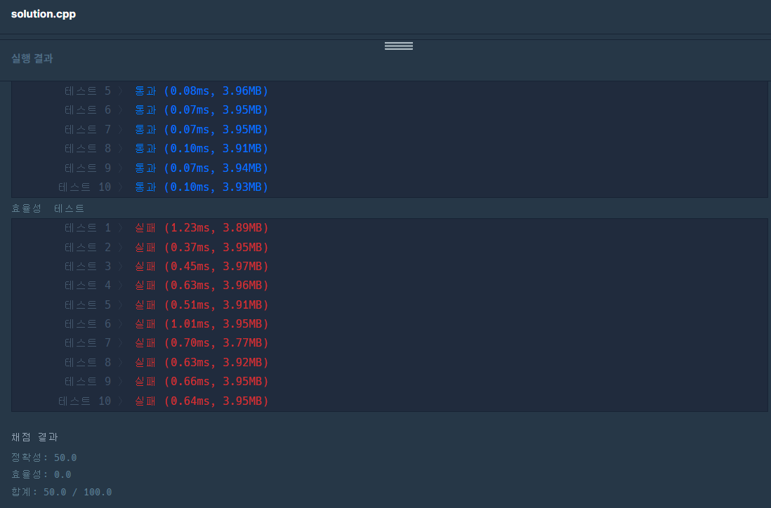 문제에서는 오버플로를 방지하기 위해 계산 결과에 1,000,000,007로 나눈 나머지를 구하도록 하고 있다. 그렇다고 최종 결괏값에 1,000,000,007를 나누면, 계산과정에서 발생할 수 있는 오버플로는 처리할 수 없기 때문에 원하는 결괏값을 얻을 수 없다. 만약 오버플로가 발생한다면 아래의 이미지처럼 정확성 테스트에서는 모두 통과하지만 효율성 테스트에서는 모두 오답이 발생한다.