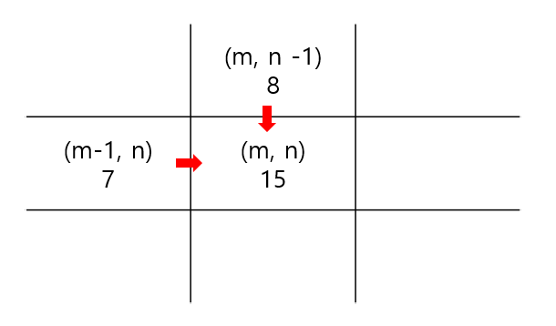문제의 답을 구하기 위해서 먼저 일반화할 수 있는 규칙을 살펴보자. 격자 모양의 등굣길에서 임의의 점 (m, n)까지 갈 수 있는 최단경로의 개수는 어떻게 구할 수 있을까? 아래의 그림처럼 일반 적으로는 (m, n)으로 가는 경로는 (m-1, n)에서 오는 경로와 (m, n-1)에서 오는 두 가지의 경로뿐이다. 때문에 (m, n)으로 가는 최단 경로의 개수는 결국 (m-1, n)까지의 최단경로와 (m, n-1)까지의 최단 경로의 합이다.