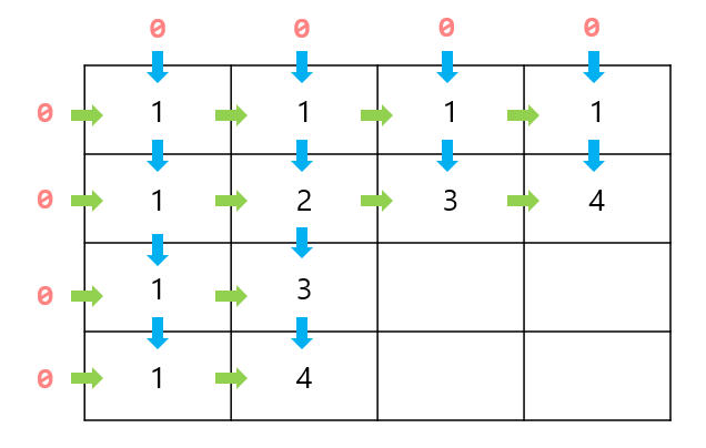 그리고 여기에는 몇 가지 예외가 존재한다. m 또는 n이 1인 경우를 살펴보자. m또는 n이 1인 경우 (m, n)으로 오는 경로는 한쪽 경로밖에 존재하지 않는다. 때문에 한쪽 경로의 값을 그대로 가져온다. 그런데, 이 예외는 일반화 공식에 포함시킬 수 있는 방법이 있다. m 또는 n이 0인 경우의 경로의 값을 0으로 하는 방법이다. 그렇게 될 경우 0은 더해도 값의 변화가 없기 때문에 한쪽 경로의 값을 그대로 가져온 것과 동일한 결과가 나온다. 단 시작 위치(집의 위치)를 1로 설정하기만 하면 쉽게 일반화할 수 있다.