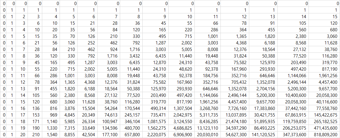 위 식을 구현함에 있어서 주의해야 할 점이 있다. m과 n의 크기가 커짐에 따라 f(m, n)의 크기는 기하급수적으로 커질 수 있다. 아래는 m = 15, n=20 인 경우 나올 수 있는 값의 최댓값들을 엑셀로 계산한 결과이다. 문제에 m과 n의 최댓값은 100이기 때문에 계산과정에서 오버플로가 발생할 수 있다.
