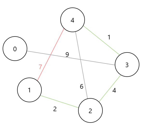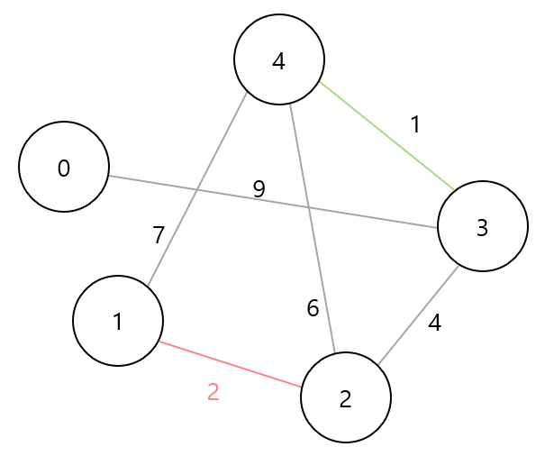비용이 7인 간선도 마찬가지로 노드 1과 노드 4가 이미 연결되어 있기 때문에 불필요한 연결이다. 비용이 7 인 간선도 선택하지 않고 넘어가자.