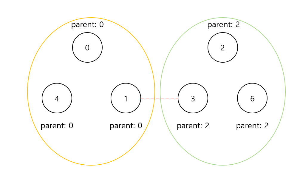 위 그림처럼 모든 노드는 부모 노드의 정보를 가진다. 그리고 부모노드가 자신과 동일하다면 그 노드가 곧 부모 노드이다. 만약 새로운 간선이 노드 1과 노드 3이 연결되어 있음을 확인하고 싶다면, 서로의 부모 노드를 확인하면 된다. 노드 1의 부모노드와 노드 3의 부모 노드는 서로 다르기 때문에 연결되어 있지 않다고 볼 수 있다. 그리고 서로 연결을 한 후에는 부모 노드 정보를 갱신한다.