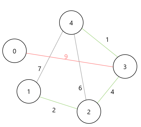 마지막으로 비용이 9인 간선은 노드 0과 노드 3을 연결한다. 이 둘은 서로 연결되지 않은 노드이기 때문에 연결해준다.