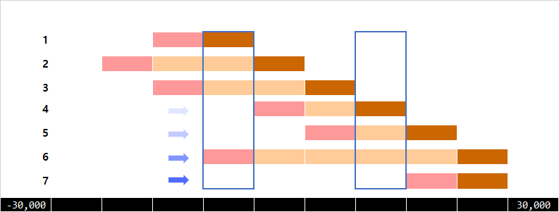 해당 위치에 카메라를 설치하면 2번, 3번, 6번 차량도 해당 카메라와 만나게 된다. 그렇다면 그 다음 카메라가 필요한 위치는 어디일까? 방금 카메라가 설치된 위치 이후에 진입한 차가 나가기 전에는 새로운 카메라가 설치되어야 할 것이다. 즉, 첫 번째 차량의 진출 시점보다 늦게 진입한 차량이 나올때 까지 탐색을 실시한다. 4번 차량이 방금 설치한 위치 이후에 진입하였다. 그럼 다음 카메라는 어디에 설치해야 할까? 방금 설치한 카메라와 가능한 멀리 설치하는 것이 좋지 않겠는가? 하지만 4번 차량이 나가기 전에는 카메라가 하나쯤은 있어야 할 것이다.