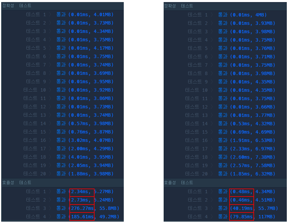 해시 테이블의 find 함수의 시간 복잡도는 \(O(1)\)이지만 연산량이 적지 않다. 더욱이 문자열이 길어질수록 성능은 매우 떨어지게 된다. 또한 substr 함수도 문자열 길이만큼의 시간 복잡도를 가진다. 결국 해당 반복문은 \(O(t^2 \cdot n)\) 시간 복잡도를 가지게 된 셈이다. 문자열의 최대 길이가 20으로 한정되어 있어 사용할수 없을 만큼 느린것은 아니지만 이번 트라이를 활용한 풀이에 비하면 다소 느리다고 할 수 있다. 이번 트라이 풀이에서 사용한 배열의 GetIndex 함수의 연산은 오직 뺄셈연산 하나로 이루어져 있기 때문이다. 그래서 같은 \(O(1)\) 시간 복잡도를 가졌지만 아래 그림 4와 같이 2~5배가량의 성능 차이를 보이게 된다.