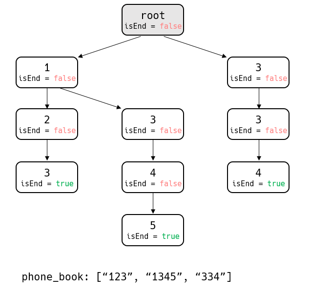 트라이 자료구조를 사용할 때 가장큰 장점은 모든 문자열을 다 삽입하지 않더라도, 문자열을 삽입하는 중간에 접두사인지 아닌지 바로 파악할 수 있다. (기준 해시 테이블만 사용한 풀이에서는 모든 전화번호를 해시 테이블에 삽입 후 하나씩 확인했었다.) 이를 위해서 우리는 문자열 삽입 과정에서 bool 값을 반환할 Insert 함수를 가진 Trie 클래스를 아래와 같이 정의할 수 있다.