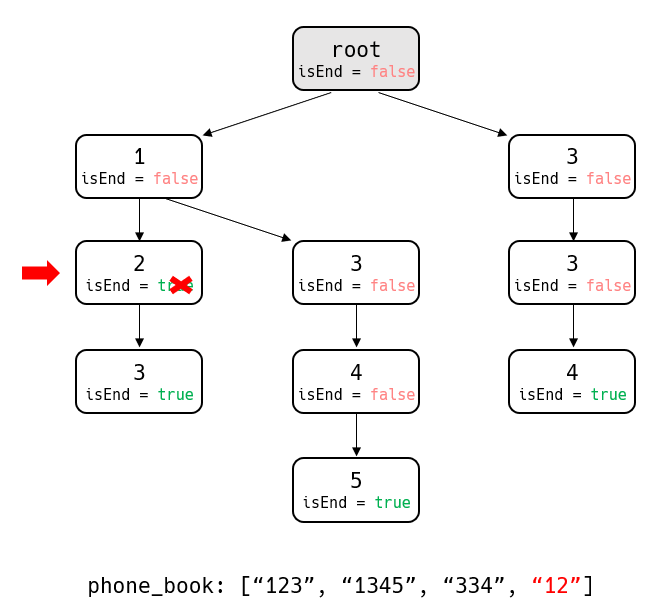 이 번에는[그림 1] 트라이에 전화번호 "12"를 삽입해보자. "12"는 "123"의 접두사이기 때문에 유효할 수 없다. 우리는 "12"를 삽입할 때 노드 "2"의 자식 노드가 있는지 확인할 수 있다. "2"에 자식 노드가 있다면 "12"는 어떠한 번호의 접두사 전화번호가 되기 때문에 이러한 삽입은 유효하지 않다는 것을 알 수 있다. 따라서 일반적인 트라이 노드 삽입 함수에 [그림 2], [그림 3]과 같은 상황에는 false를 반환도록 Insert 함수를 구현할 수 있을 것이다.