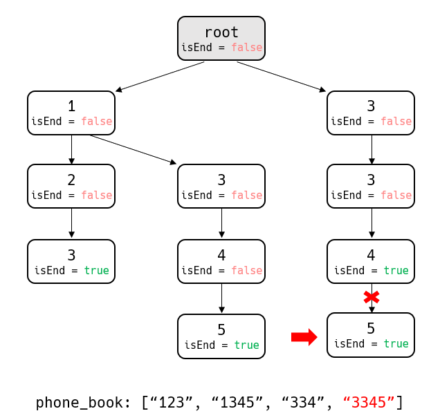 새로운 번호 "3345"는 "334"를 접두사로 가지는 번호이다. "3345"를 삽입하기 위해서는 노드 3→3→4를 지나와야 한다. 그런데 노드 4는 이미 isEnd 가 true로 설정되어 있다. 이번 예시에서 true로 설정된 노드 이후에 새로운 자식 노드가 들어온다면 해당 전화번호가 유효하지 않다는 사실을 알 수 있다. 다른 예시도 살펴보자.