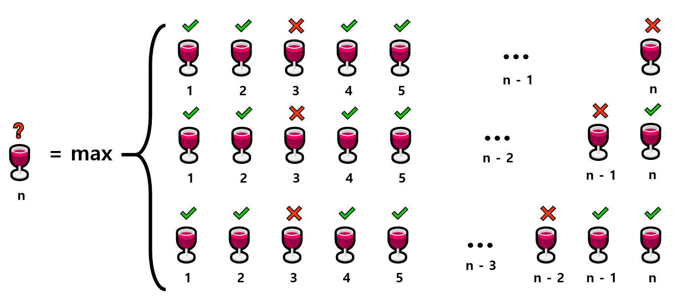 이를 일반화 해서 생각해 보자. n개의 포도주잔이 있을 때 n번째 잔을 마시는 것이 좋을지 마시지 않는 것이 좋을지 우리는 판단할 수 있어야 한다.