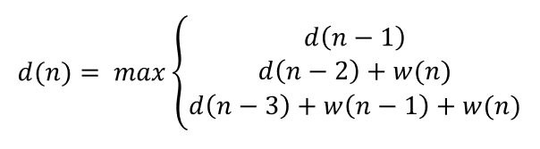 점화식을 살펴보면 d(n)을 구하기 위해서 d(n-1), d(n-2), d(n-3)의 값을 계산해야 한다. d(n-1), d(n-2), d(n-3) 값들도 각각 d(n-2), d(n-3), d(n-4)... 등의 계산을 요구한다. 만약 그때마다 해당 값들을 새로 계산해야 한다면 계산량은 \(O(3^n)\)이 될 것이고 이는 사용할 수 없을 정도로 많은 계산량을 요구한다. 때문에 동적계획법을 활용하여 한 번 계산한 d(n)값은 다시 계산하지 않도록 배열에 저장하자. 그러면 계산량은 \(O(n)\)으로 많이 개선될 수 있다.