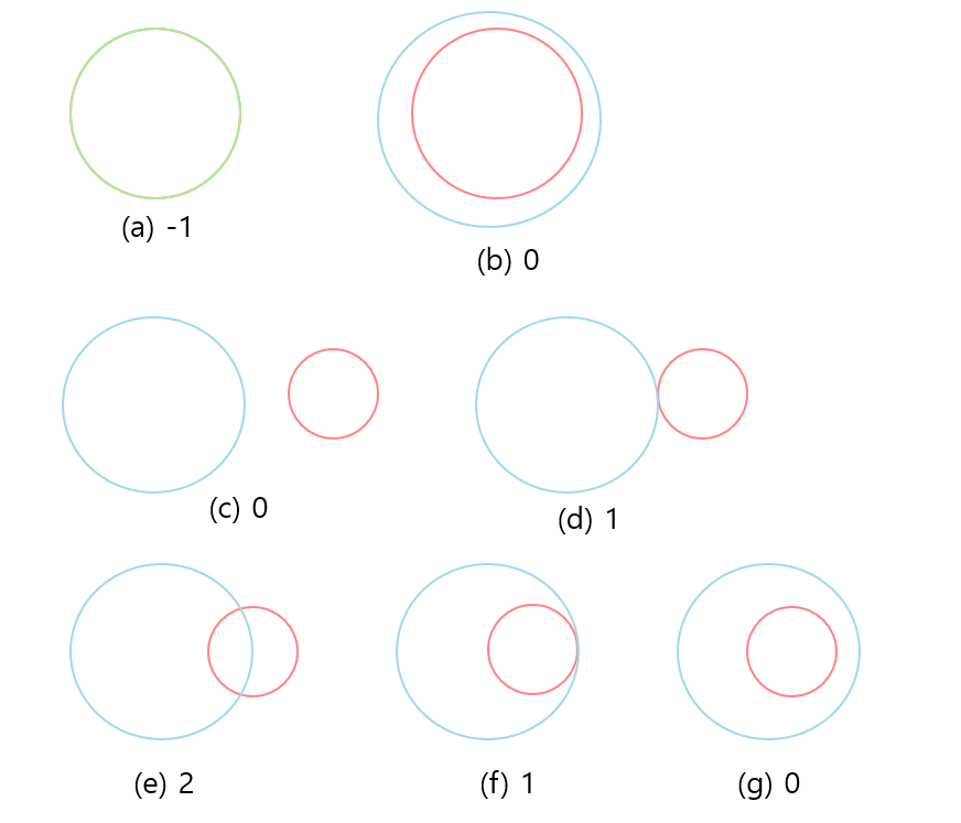 이 문제에서 마린이 존재할 수 있는 위치라는 것은 결국 터렛의 각 좌표를 원의 원점, 마린까지 거리를 원의 반지름으로 하는 두 개의 원의 교점 개수를 묻는 것과 동일하다. 원의 교점은 아래와 같이 7가지의 경우가 존재할 수 있다.
